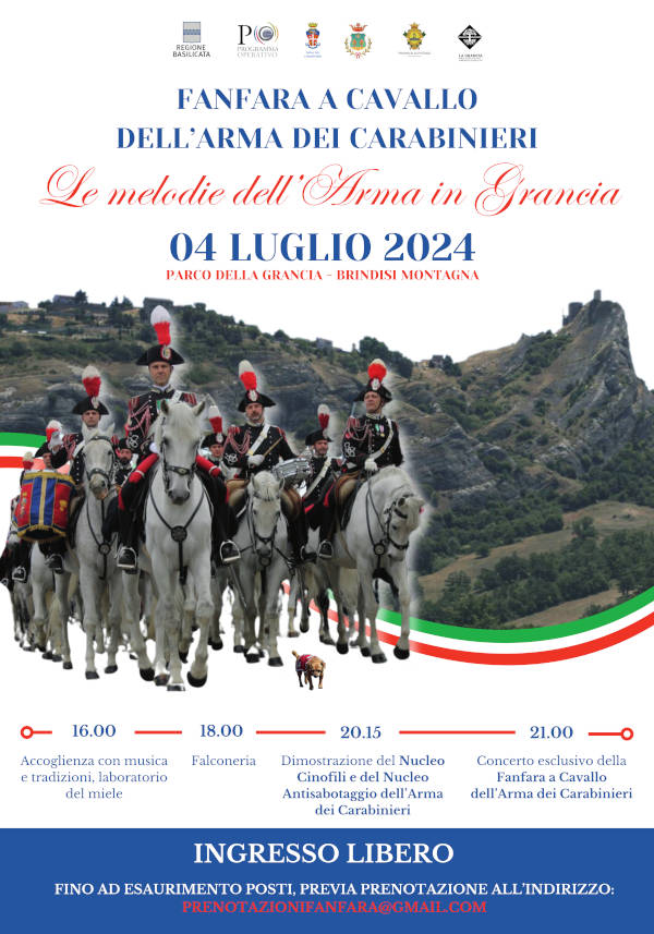 Per la prima volta nella sua storia, giovedì 4 luglio 2024 alle ore 21.00, la fanfara del 4° Reggimento a Cavallo dell’Arma dei Carabinieri si esibirà in Basilicata nel Parco Naturale della Grancia, scenario di rara bellezza e suggestione nonché tangibile testimonianza della certosina ricerca volta a valorizzare la memoria storica ed il recupero delle radici della cultura rurale.