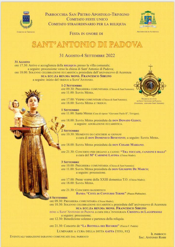 Alle 17.30 presso la villa comunale di Trivigno arriverà da Acerenza la reliquia di Sant’Antonio da Padova.