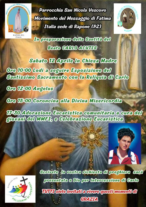 A Rapone, la Parrocchia San Nicola Vescovo sede del Movimento del Messaggio di Fatima, è custode della Reliquia di Carlo Acutis, un giovane morto a solo 15 anni offrendo la Sua sofferenza per il papa, la conversione dei giovani e tutta la Chiesa.