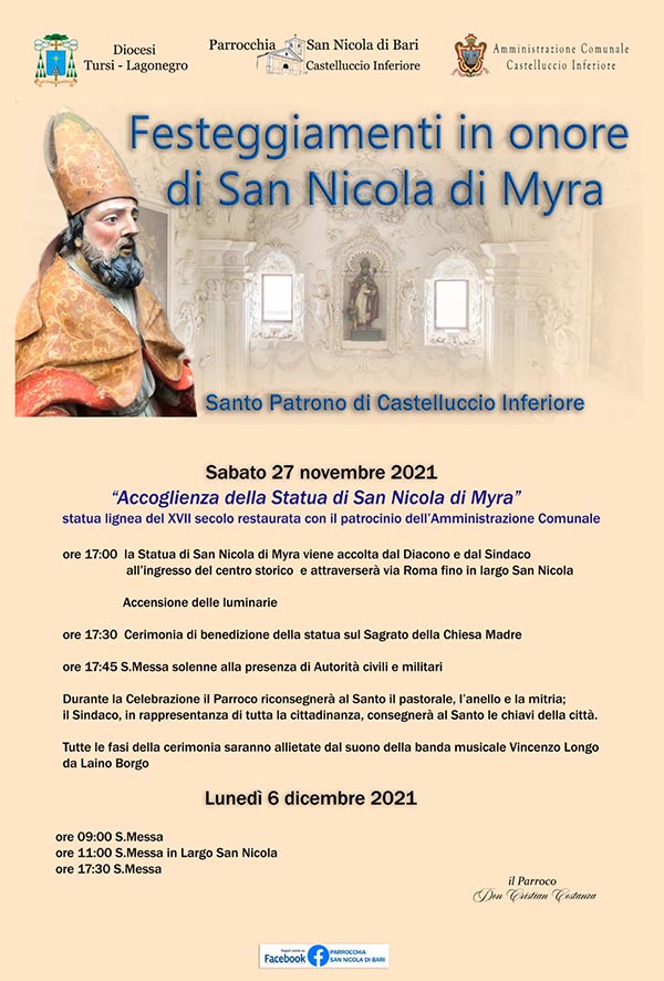 L’amministrazione del comune di Castelluccio Inferiore (PZ) rende noto che Sabato 27 Novembre 2021, avrà luogo l’accoglienza della Statua di San Nicola di Myra, statua lignea del XVII secolo restaurata con il patrocinio dell’Amministrazione Comunale.