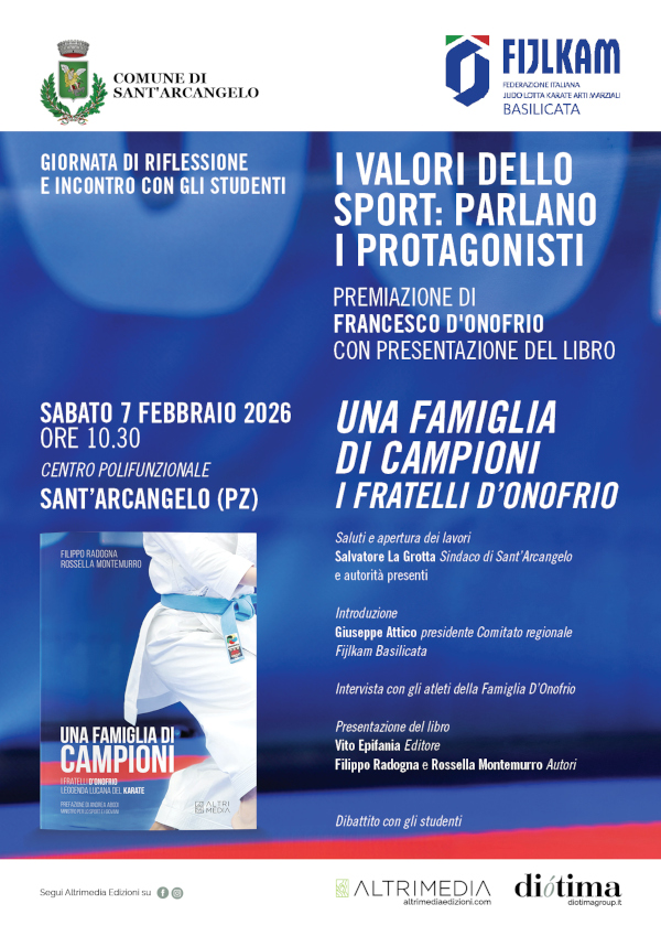 Nel corso dell’evento, promosso dalla FIJLKAM (Federazione Italiana Judo Lotta Karate Arti Marziali) Basilicata in collaborazione con il Comune di Sant’Arcangelo, sarà presentato il libro “Una famiglia di campioni. I fratelli D’Onofrio, leggenda lucana del karate” (Altrimedia Edizioni, prefazione del ministro per lo Sport e i giovani Andrea Abodi) di Filippo Radogna e Rossella Montemurro.