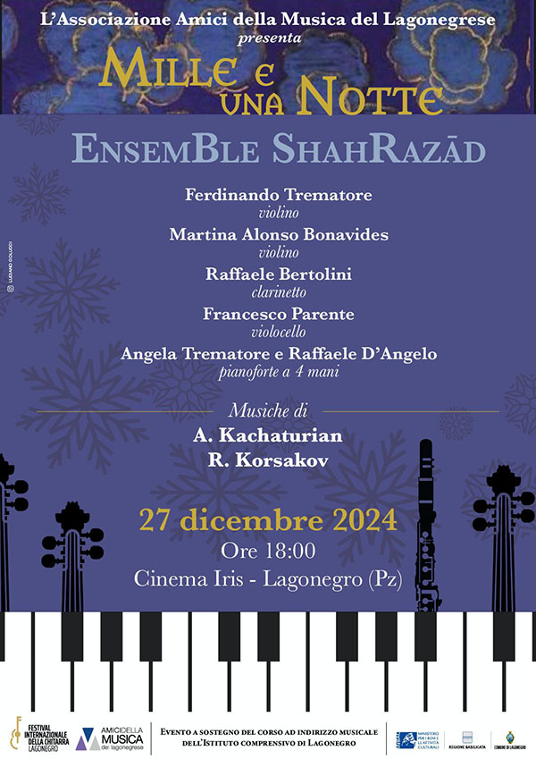 Il gruppo noto per la sua capacità di evocare atmosfere suggestive e coinvolgenti, condurrà il pubblico in un viaggio musicale ispirato alle incantevoli storie delle Mille e Una Notte attraverso l’interpretazione delle partiture di A.Kachaturian e R.Korsachov e promette di regalare emozioni indimenticabili agli spettatori di tutte le età.