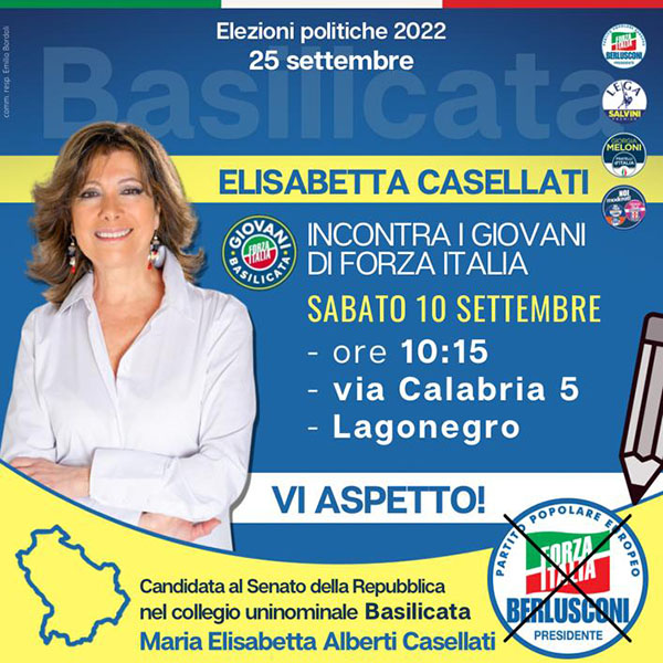 Si terrà domani, Sabato 10 Settembre, alle ore 10:30 presso il circolo padel “Materdei” di Lagonegro (PZ) un incontro per discutere di politiche giovanili e imprenditoria giovanile tra i giovani di forza Italia e la Presidente del Senato Elisabetta Maria Alberti Casellati.