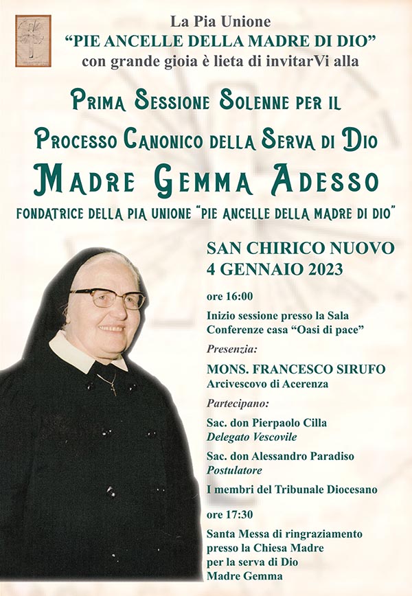 - della Serva di Dio madre Gemma Adesso, fondatrice delle Pie Ancelle della Madre di Dio, con sede in S. Chirico Nuovo, in diocesi di Acerenza (PZ).