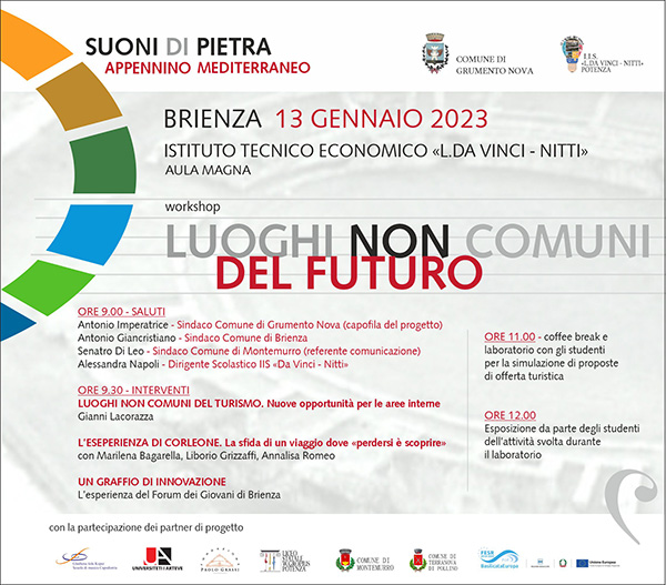 Si è tenuto ieri mattina nella sede di Brienza dell’IIS “L. Da Vinci Nitti” il seminario “Luoghi non comuni del futuro” del progetto S.P.A.M. (Suoni di Pietra d’Appennino Mediterraneo) finanziato dall’avviso pubblico “cooperazione interregionale e transnazionale”, da parte della Regione Basilicata attraverso il PO Fesr 2014/2020.