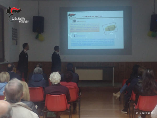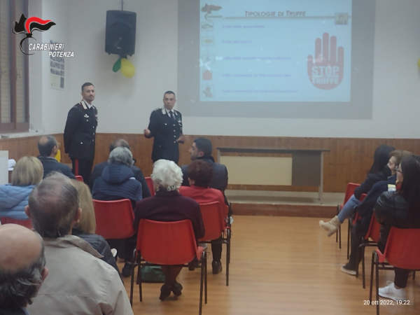L’Ufficiale, accompagnato dal Maresciallo Ordinario Andrea De Paduanis, Comandante della Stazione di Bella, alla presenza del sindaco e del parroco, si è rivolto ai presenti indicando le più comuni modalità con le quali vengono perpetrate tali truffe, come le telefonate di presunti avvocati, carabinieri o appartenenti alle forze di polizia, nel corso delle quali vengono rappresentati alle ignare vittime incidenti stradali od eventi insoliti, occorsi a propri familiari, per fronteggiare i quali vengono richieste somme di denaro, poi, prontamente prelevate da compici che, subito dopo, giungono presso la loro abitazione.