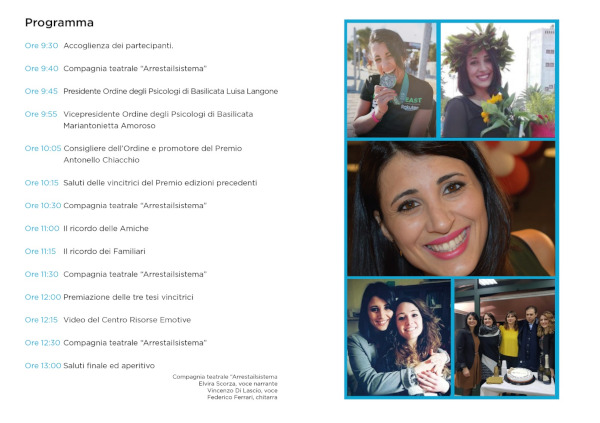 Intenso il programma della giornata che prevede più momenti dedicati; dopo i saluti istituzionali, a cura della presidente dell’Ordine degli Psicologi di Basilicata, Luisa Langone, della vicepresidente, Mariantonietta Amoroso, del consigliere e promotore del Premio, Antonello Chiacchio, le testimonianze delle vincitrici delle edizioni precedenti e il ricordo delle amiche e dei familiari, la premiazione delle tre tesi vincitrici.