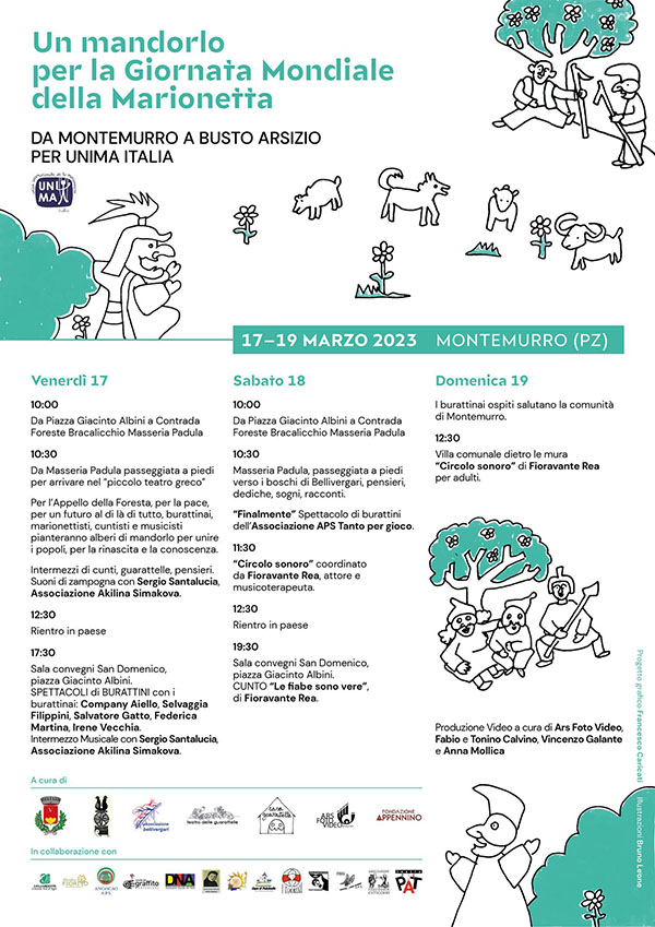 Un mandorlo per la GMM (giornata mondiale della Marionetta), da Montemurro (PZ) a Busto Arsizio un’idea di Rosellina Leone realizzata con Company Aiello, Selvaggia Filippini, Salvatore Gatto, Federica Martina, Fioravante Rea, Irene Vecchia, e APS Tanto per Gioco, Associazione Bellivergari di Montemurro.