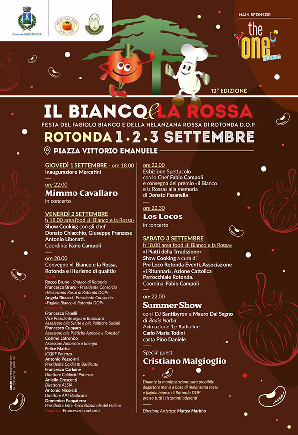 Seguirà alle ore 20:00 il convegno dal titolo “il Bianco e la Rossa, Rotonda ed il turismo di qualità”, al quale prenderanno parte, il sindaco Rocco Bruno, il presidente del Consorzio “Melanzana rossa di Rotonda dop” Francesco Bruno, la presidentessa del consorzio “Fagiolo Bianco di Rotonda dop” Angela Ricucci.