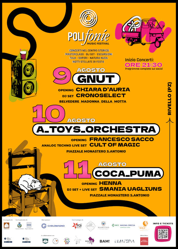 La quinta edizione di Polifoníe music festival è prodotta dall’Associazione Culturale Terrarossa con il patrocinio della Regione Basilicata e del Comune di Rivello. Main sponsor del festival il Gruppo Carlomagno con sede a Lagonegro, Polifoníe è supportato da Arci Basilicata, Studio Geometra Camele e BCC Magna Grecia e si avvale della preziosa collaborazione di: Pro Loco di Rivello, la Consulta Giovanile di Rivello, il Centro Mediterraneo delle Arti, l’associazione Venti aps, Basilicart, la BAM di Sapri , Immateria, Young LEE, Casa Vinicola Martino srl e Bykes beer.