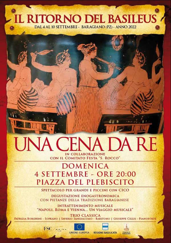 “La settimana delle manifestazioni del “Ritorno del Basileus” presso il Comune di Baragiano si aprirà domani all’insegna della enogastronomia con “Una cena da Re” in Piazza del Plebiscito alle h 20.00, degustazione delle pietanze della tradizione baragianese in collaborazione con il comitato festa “S. Rocco”.
