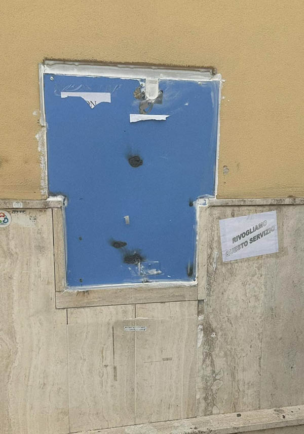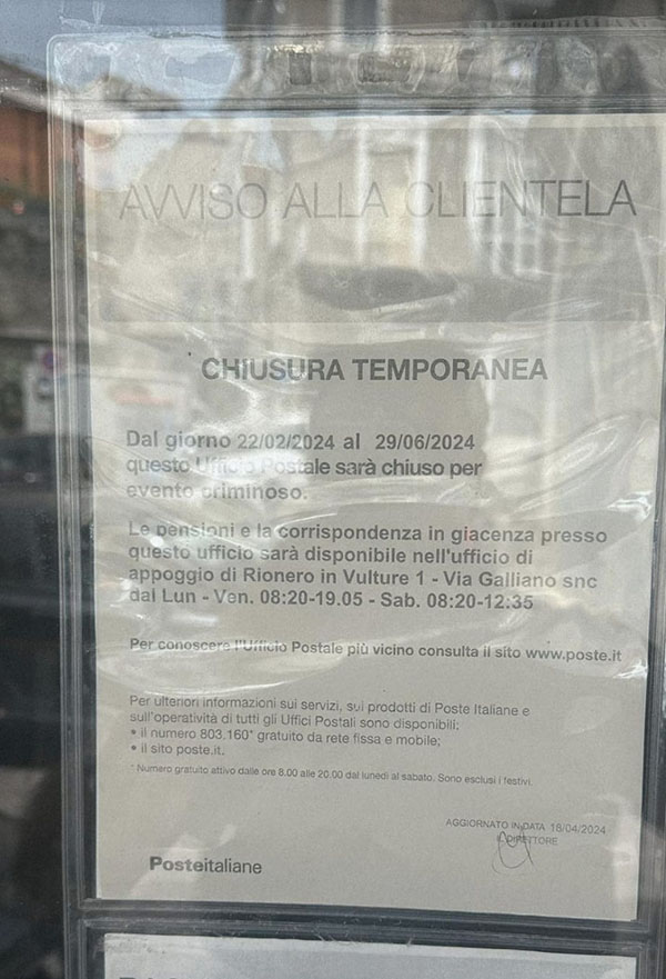 Le immagini fotografiche scattate il 20 giugno 2024 mostrano chiaramente che nessun lavoro di ripristino è stato iniziato, nonostante il cartello affisso all’ingresso dell’ufficio postale prometta una riapertura entro il 29 giugno 2024.