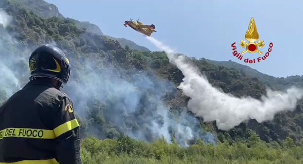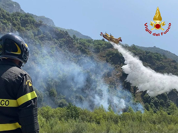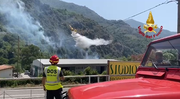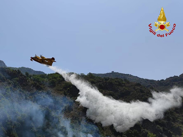 L’intervento del DOS Vigili del Fuoco (Direttore Operazioni di Spegnimento) ha reso possibile l’intervento del mezzo aereo che ha effettuato diversi lanci per poter spegnere l’incendio.