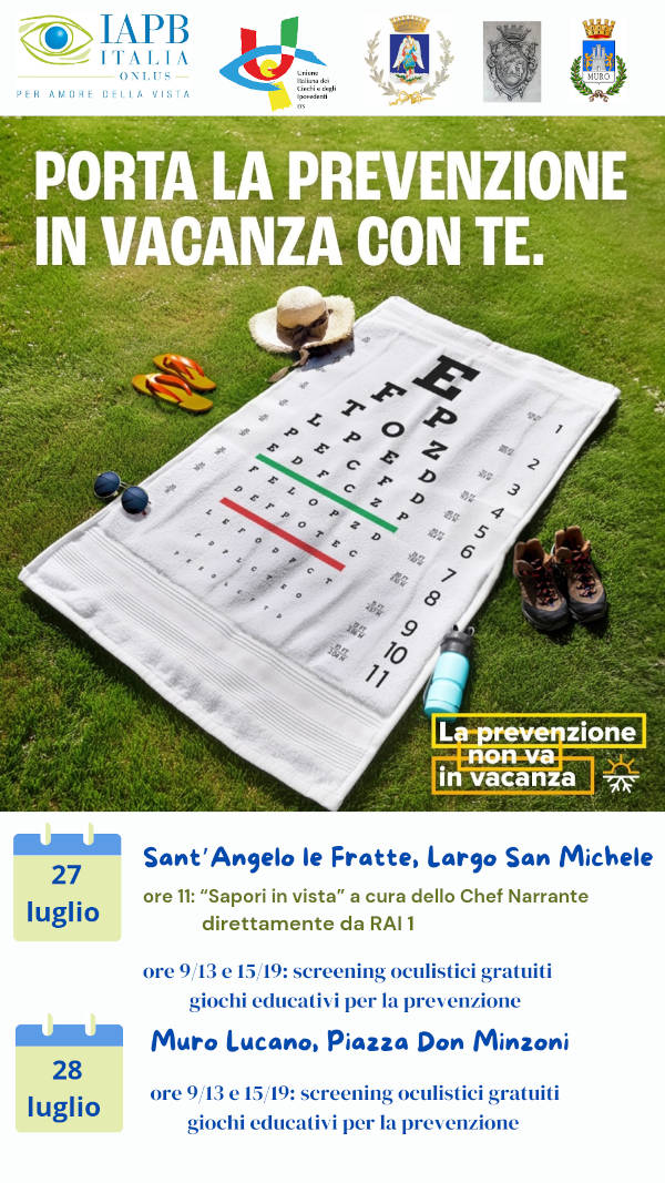 Due gli eventi in programma, nell’ambito della campagna nazionale promossa da IAPB Italia Onlus, rispettivamente il 27 luglio p.v nel comune di Sant’Angelo Le Fratte e il 28 in quello di Muro Lucano.