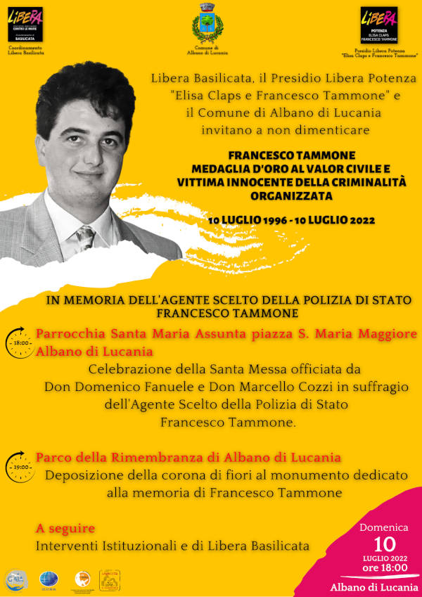 Tra pochi giorni saranno trascorsi ventisei anni da quella tragica sera del 10 luglio 1996, quando l’Agente Scelto della Polizia di Stato Francesco Tammone, in servizio presso l’Ufficio Prevenzione Generale e Soccorso Pubblico di Potenza, di pattuglia durante un servizio di controllo del territorio in un quartiere periferico del capoluogo potentino, veniva colpito a morte da alcuni colpi di pistola esplosi da un pregiudicato del posto, in regime di semilibertà.