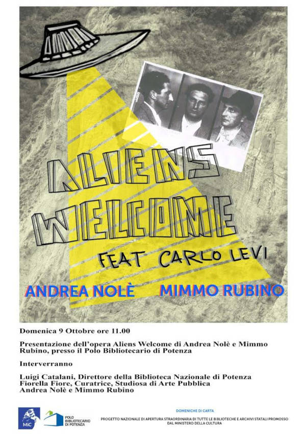 Domenica 9 Ottobre, alle ore 11:00, in occasione delle”Domeniche di carta” si svolgerà la presentazione dell’opera di arte pubblica Aliens Welcome, realizzata da due giovani artisti lucani, Andrea Nolè e Mimmo Rubino, collocata nell’atrio di ingresso del Polo Bibliotecario di Potenza.