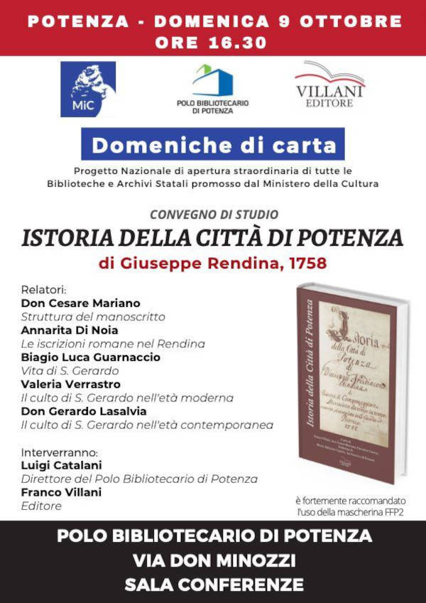 Dalle ore 17:00 alle ore 19:00 è previsto un seminario di studi sul volume Istoria della Città di Potenza (Villani Editore), con la partecipazione di storici, archivisti e archeologi.