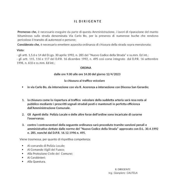 “Premesso che, è necessario eseguire da parte di questa Amministrazione, i lavori di riparazione del manto bituminoso sulla strada denominata Via Carlo Bo, per la presenza di numerose buche che rendono pericoloso il transito di automezzi e persone;