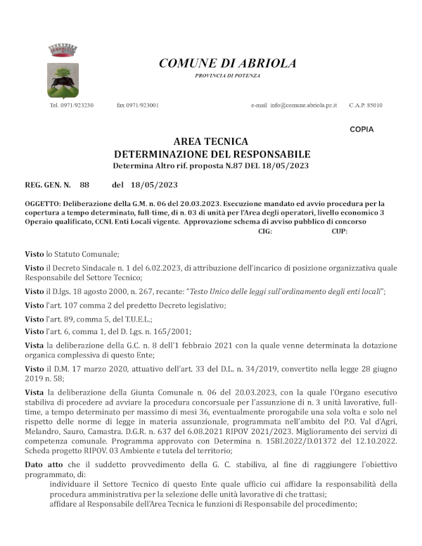 “procedure per la copertura a tempo determinato, full-time, di n. 3 unità per l’Area degli operatori, livello economico 3, CCNL Enti Locali vigente, Operaio qualificato in questo Ente a tempo determinato per un massimo di mesi 36, eventualmente prorogabile una sola volta e solo nel rispetto delle norme di legge in materia assunzionale, programmata con deliberazione della G.C. n. 06 del 20.03.2023″.