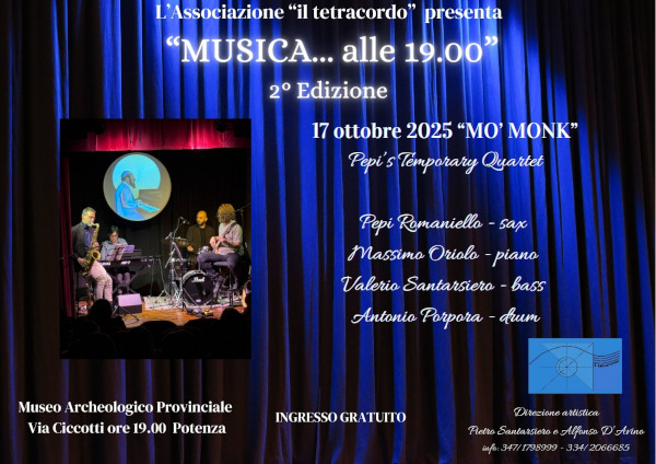 Il concerto inaugurale avverrà il 17 ottobre con lo spettacolo “Mo’ Monk” del quartetto jazz lucano formato da Pepi Romaniello (Sax), Massimo Oriolo (Piano), Valerio Santarsiero (Bass) e Antonio Porpora (Drum).