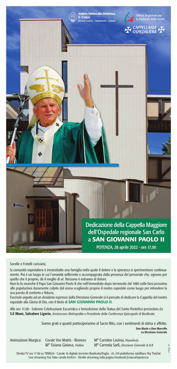 A oltre quarant’anni dalla prima visita pastorale di Papa Giovanni Paolo II all’ospedale ‘San Carlo’ di Potenza, il direttore generale Giuseppe Spera ha manifestato a S.E. Mons. Salvatore Ligorio il personale desiderio di dedicare la cappella ospedaliera alla sua santa opera e memoria.