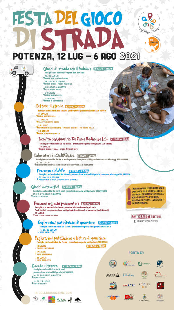 A Potenza, in versione diffusa, la terza edizione della Festa del gioco di strada realizzata nell’ambito del progetto “Un, due, tre … stelle!” promosso dalla cooperativa sociale Centostrade in collaborazione con l’Istituto Comprensivo Leopardi e una rete di 9 partner di terzo settore (Consorzio C.S., La luna al guinzaglio, CiclOstile, Zer0971, Officina 0, ParimPari, Libreria Senzanome, Lithodora).