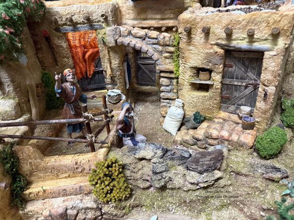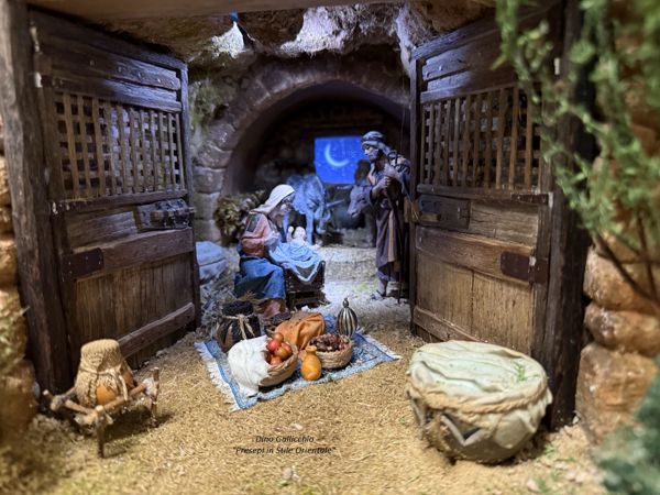 Attenendosi il più possibile a queste informazioni, l’artista ha dato vita a questa scenografia in un’ambientazione tipica dei luoghi e del tempo dove è avvenuta la nascita di Gesù.