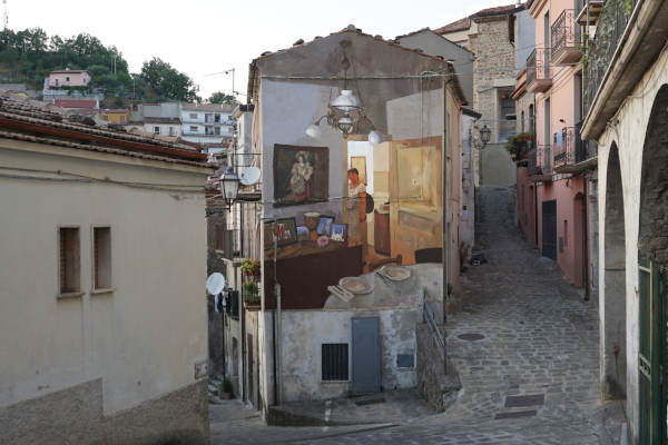 Una serie di piccoli elementi all’interno dell’opera rimanda alla storia di ciascun abitante di San Chirico, dai locali agli stranieri, mentre tutta la scena si inserisce in armonia con gli elementi del contesto circostante.