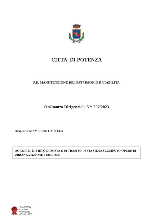 Il Comune di Potenza emana ordinanza di divieto di transito e di sosta con rimozione su via Siena, per eseguire i lavori di fresatura e posa in opera del tappetino di usura a scomputo degli oneri di urbanizzazione.