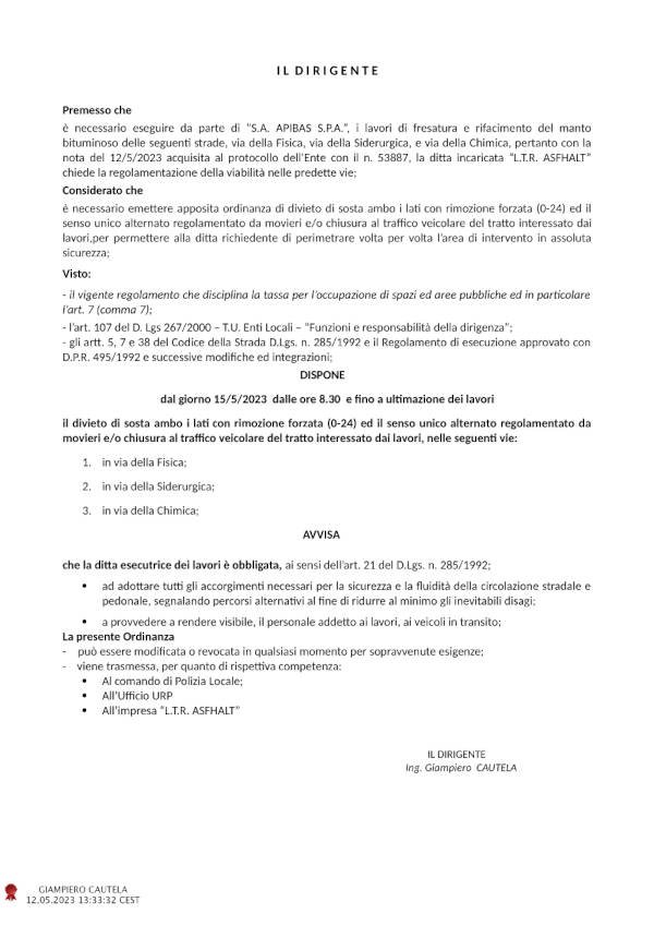 “Premesso che è necessario eseguire da parte di ‘S.A. APIBAS S.P.A.’, i lavori di fresatura e rifacimento del manto bituminoso delle seguenti strade, via della Fisica, via della Siderurgica, e via della Chimica, pertanto con la nota del 12/5/2023 acquisita al protocollo dell’Ente con il n. 53887, la ditta incaricata ‘L.T.R. ASFHALT’ chiede la regolamentazione della viabilità nelle predette vie;