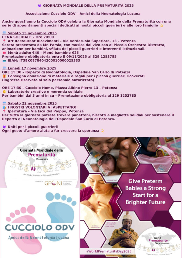 Anche quest’anno l’Associazione Cucciolo ODV – Amici della Neonatologia Lucana celebra la Giornata Mondiale della Prematurità, un appuntamento internazionale che ogni 17 novembre richiama l’attenzione sulle nascite premature e sull’importanza del sostegno ai piccoli guerrieri e alle loro famiglie.