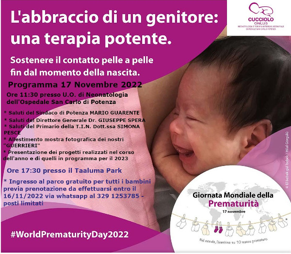 Quest’anno il tema principale di questa giornata è “l’ABBRACCIO del genitore” visto nell’ottica della prematurità come una vera e propria terapia, sostenendo l’importanza del contatto pelle a pelle tra il bambino e mamma e papà, come parte integrante della cura per i bambini ricoverati nella Terapia Intensiva Neonatale.