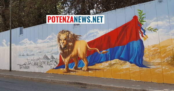 Due le pareti interessate, di cui questa che vi mostriamo (quasi completa) con il Leone in primo piano, un cielo che a tratti si scorge terso e la bella e storica Potenza sullo sfondo.