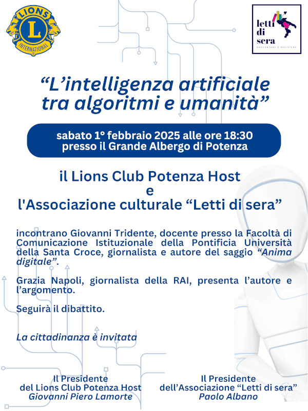 L’evento è organizzato dal Lions Club Potenza Host e dall’Associazione culturale “Letti di sera”, nell’ambito del Tema di studio nazionale “Lionismo 5.0. Intelligenza artificiale, rischi ed opportunità”.