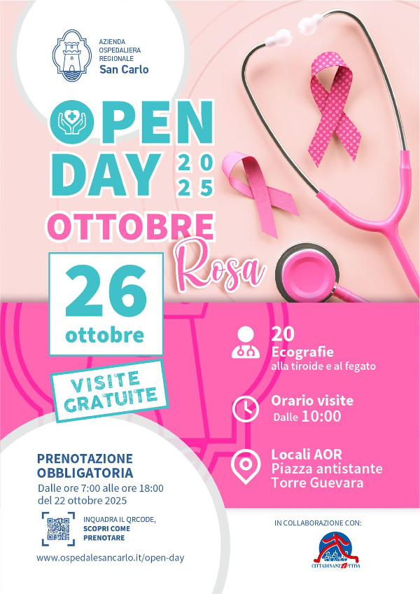 Proseguono le iniziative promosse dall’Azienda Ospedaliera Regionale San Carlo di Potenza in occasione dell'”Ottobre Rosa”, il mese dedicato alla prevenzione e alla salute delle donne, con un open day in programma domenica 26 ottobre, dalle ore 10:00, nei locali dell’Aor situati nel piazzale della Torre Guevara a Potenza.