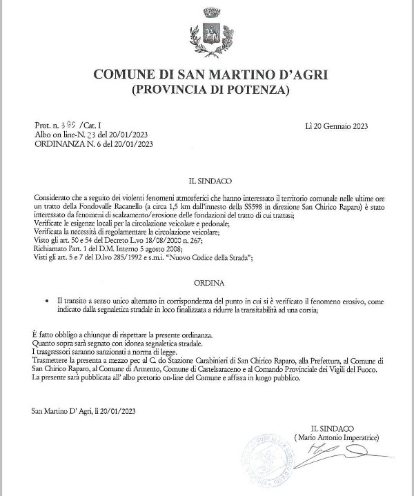 “Con ordinanza n.6 il Sindaco di S.Martino d’Agri ha disposto il transito ad una corsia, a senso unico alternato, del tratto interessato da fenomeno erosivo dovuto alle avverse condizioni meteo che hanno causato un notevole innalzamento del livello del torrente Racanello.