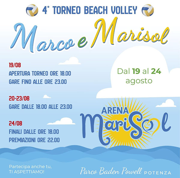 Nel polmone verde della città, il parco Baden Powell di Potenza, più precisamente nell’Arena Marisol, si terrà dal 19 al 24 agosto una manifestazione sportiva di beach volley, strutturata in 4 differenti categorie: Pro maschile 2×2, Pro femminile 2×2, Amatoriale 4×4 4 Amatoriale junior.