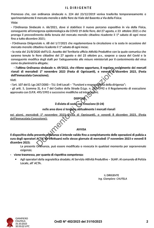 Secondo l’ultima Ordinanza sindacale N. 69/2022, che ritiene opportuno a Potenza il regolare svolgimento dei mercati rionali di Mercoledì 1° Novembre 2023 (Festa di Ognissanti), e Venerdì 8 Dicembre 2023, (Festa dell’Immacolata Concezione) viene disposto il divieto di sosta con rimozione (0-24) nelle aree dove si tengono abitualmente i mercati rionali nei giorni, Mercoledì 1° Novembre 2023 (Festa di Ognissanti), e Venerdì 8 Dicembre 2023, (Festa dell’Immacolata Concezione).