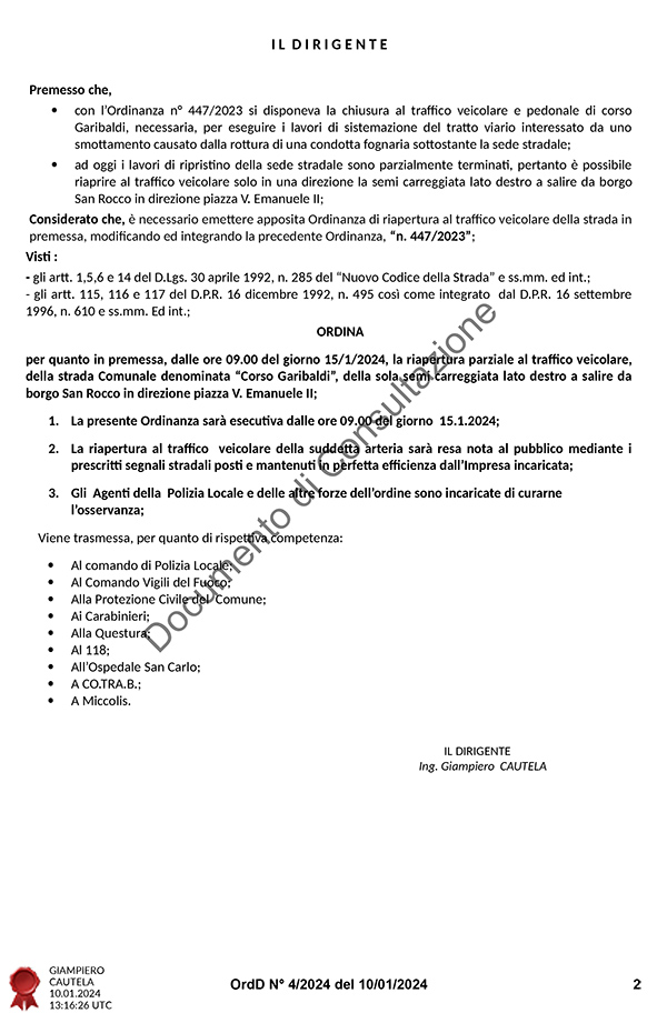 Con l’ordinanza Dirigenziale N° 4/2024 è predisposta la riapertura al traffico veicolare, a partire da Lunedì 15 Gennaio, di Corso Garibaldi solo lato destra a salire da Borgo San Rocco in direzione Piazza V. Emanuele II.