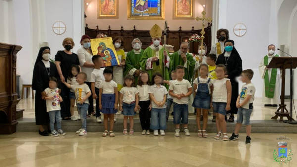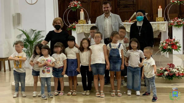 - il parroco don Salvatore Dattero, Padre Tommaso Luongo, i piccoli della Scuola Materna Comunale con l’insegnante Francesca Zirpoli;