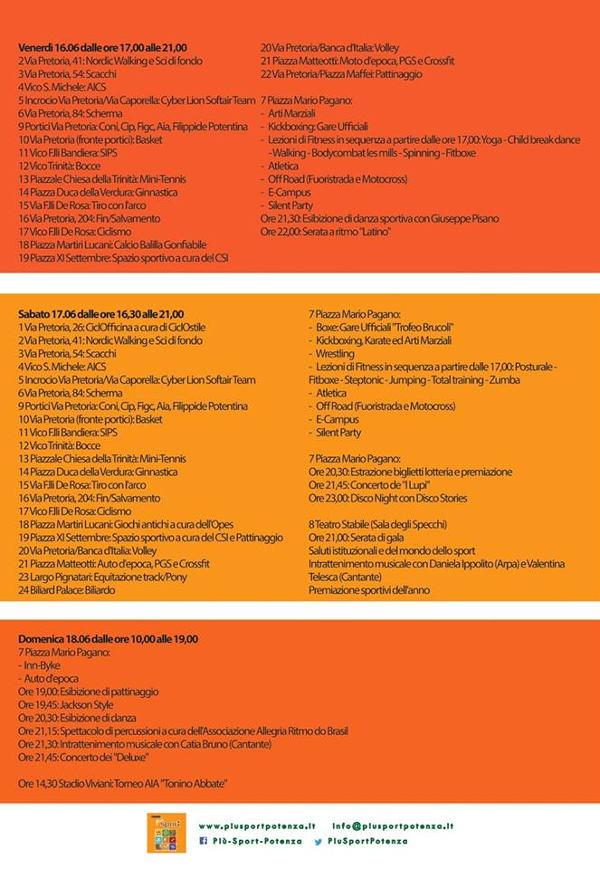 In Piazza Mario Pagano si assisterà alla rappresentazione di arti marziali, di boxe, di Kickboxing e wrestling. Sarà allestita una minipalestra con attrezzi e un maxischermo sul quale saranno trasmesse immagini di sport, di corsi virtuali, oltre allo stand dell’Off Road e del Silent Party”.