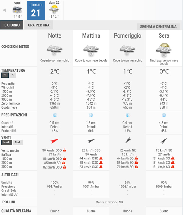 Secondo gli esperti di 3bmeteo, domani, Sabato 21 Gennaio, avremo cieli molto nuvolosi o coperti con nevicate per l’intera giornata.