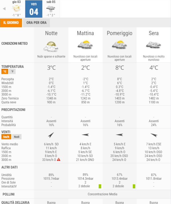 Durante la giornata di dopodomani la temperatura massima registrata pare che sarà di 1°C e la minima di -1°C.