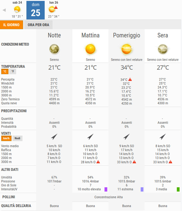 La temperatura massima registrata dovrebbe essere di 34°C, la minima di 23°C.