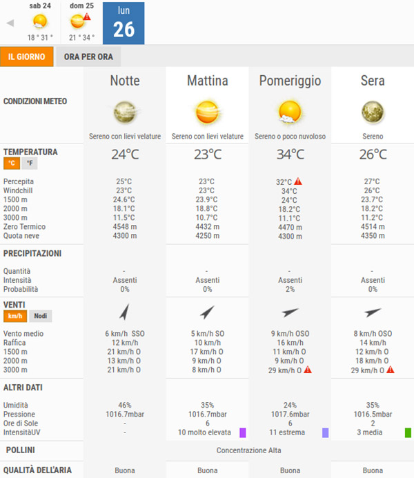 Lunedì 26 Luglio, invece, avremo cieli in prevalenza sereni o poco nuvolosi per l’intera giornata, non sono previste piogge.