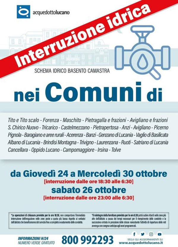 Sospensione dell’erogazione idrica da Giovedì 24 a Mercoledì 30 ottobre ogni giorno a partire dalle ore 18:30 alle 6:30 in tutti i comuni serviti dallo schema idrico Basento Camastra.