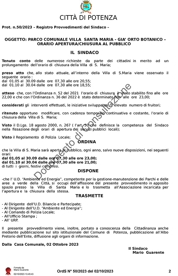 Il Comune di Potenza con Provvedimento n. 50/2023 comunica alla cittadinanza che è stato ampliato l’orario di apertura della villa di Santa Maria.