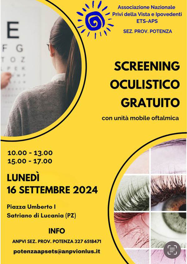 Dopo il comune di Castelmezzano, anche il Comune di Satriano di Lucania invita tutti i cittadini a prendersi cura dei propri occhi con uno screening gratuito.