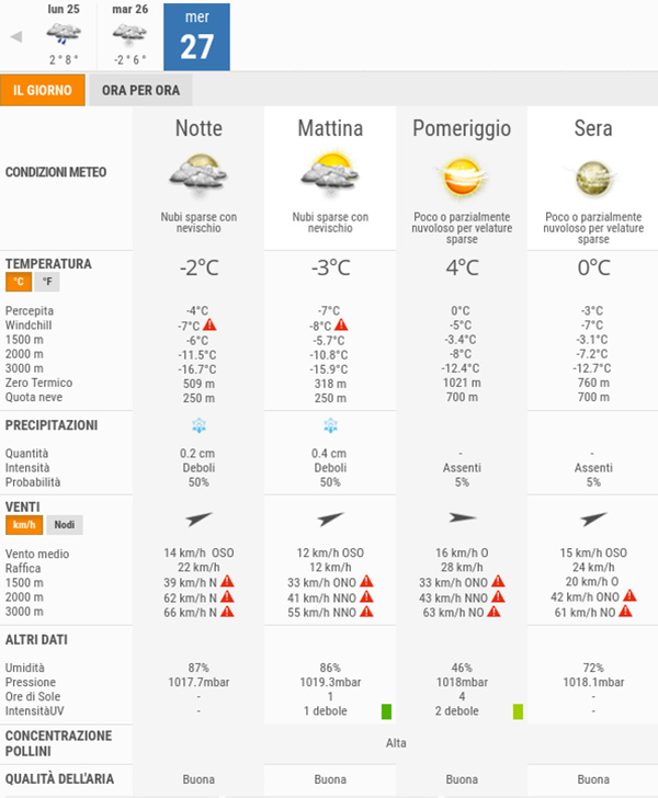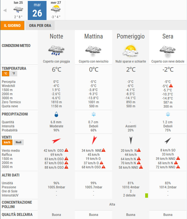 La temperatura massima registrata pare che sarà di 6°C, la minima di -2°C.