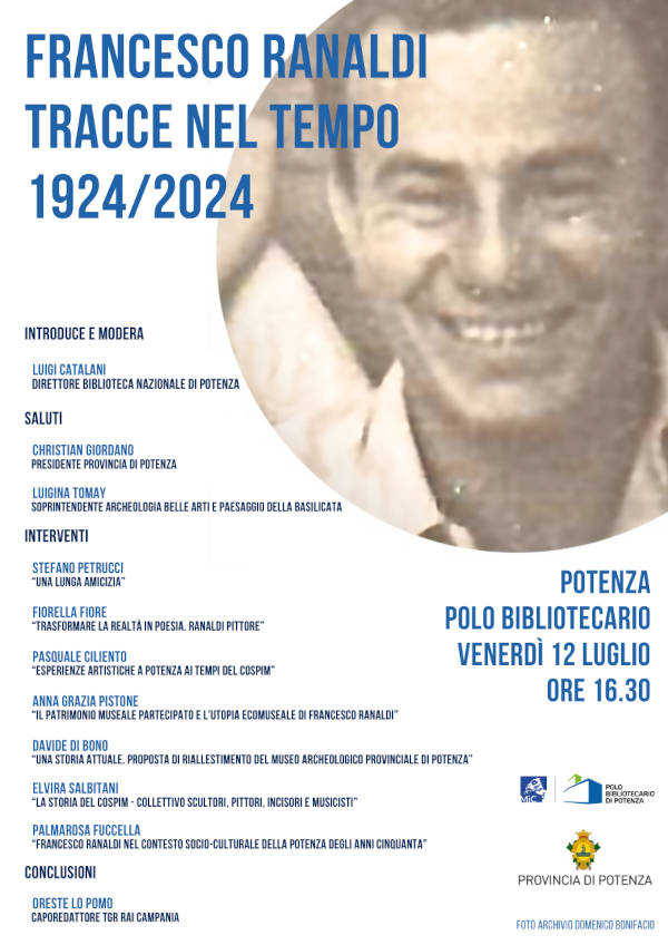 Venerdì 12 luglio, alle ore 16:30, nel Polo Bibliotecario di Potenza, si svolgerà un seminario di studi dedicato a Francesco Ranaldi nel centenario della nascita.